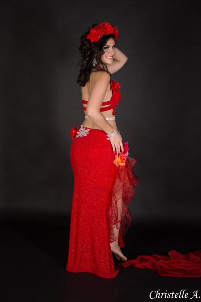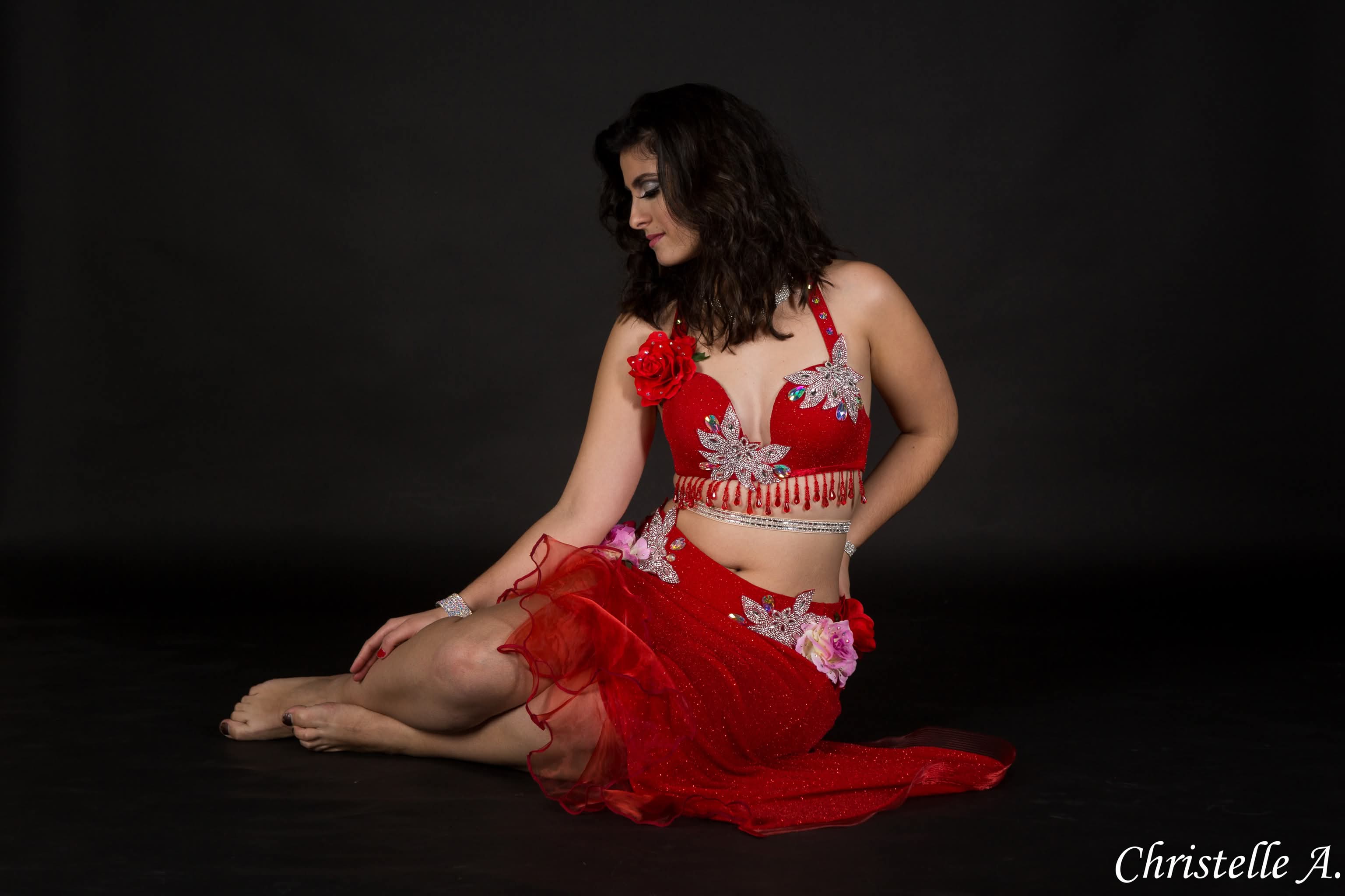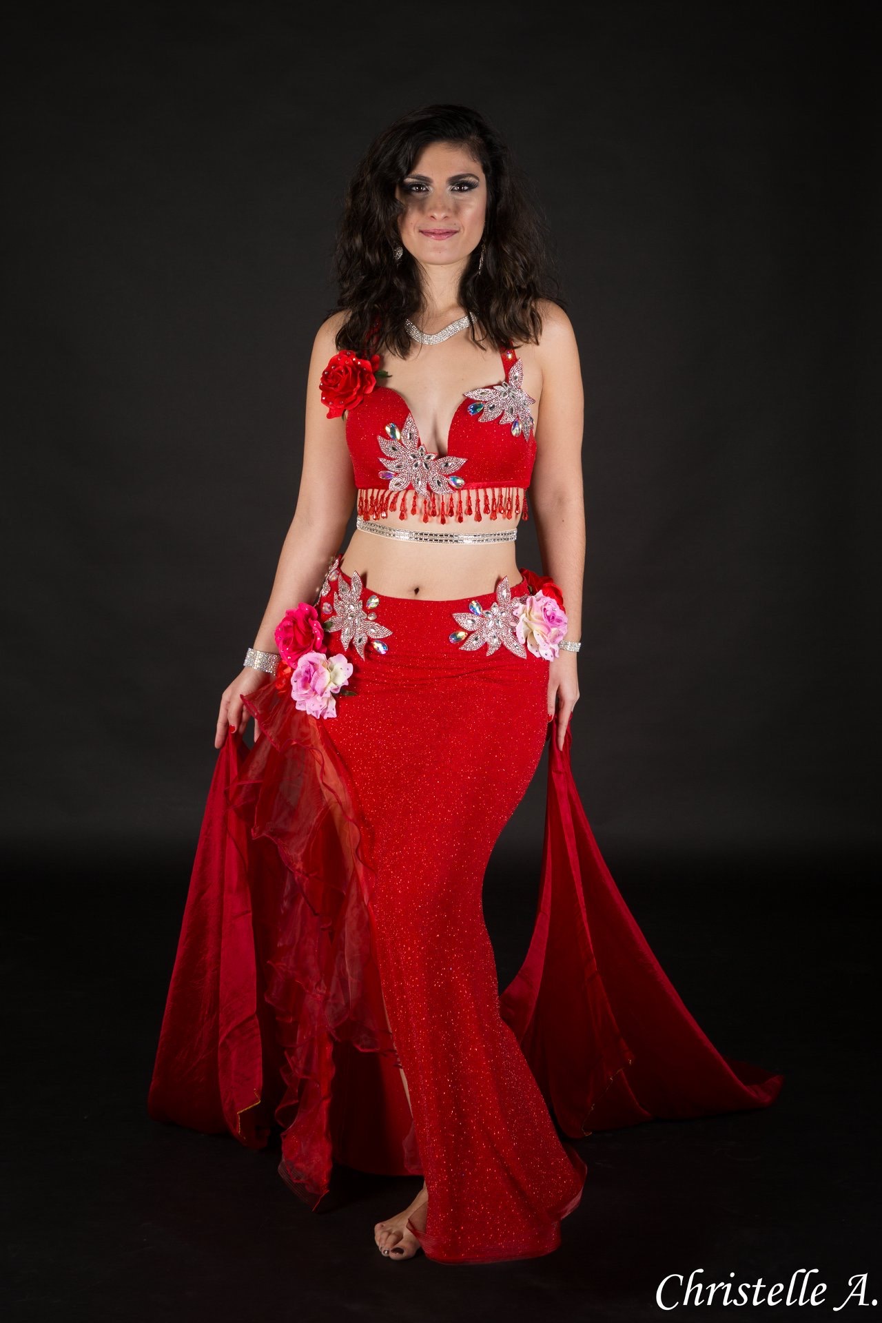 Costume rouge grosses fleurs et strass
