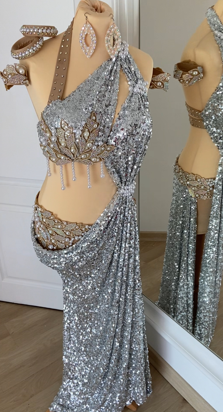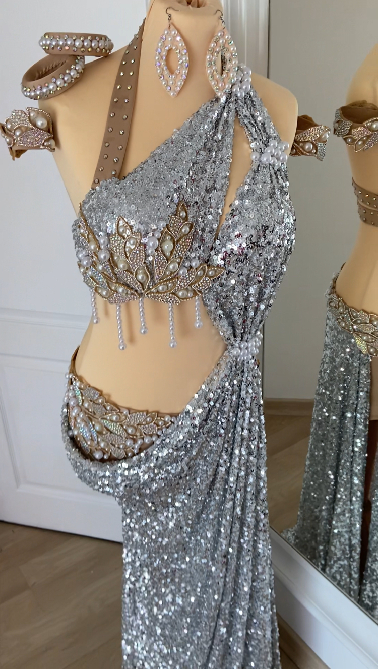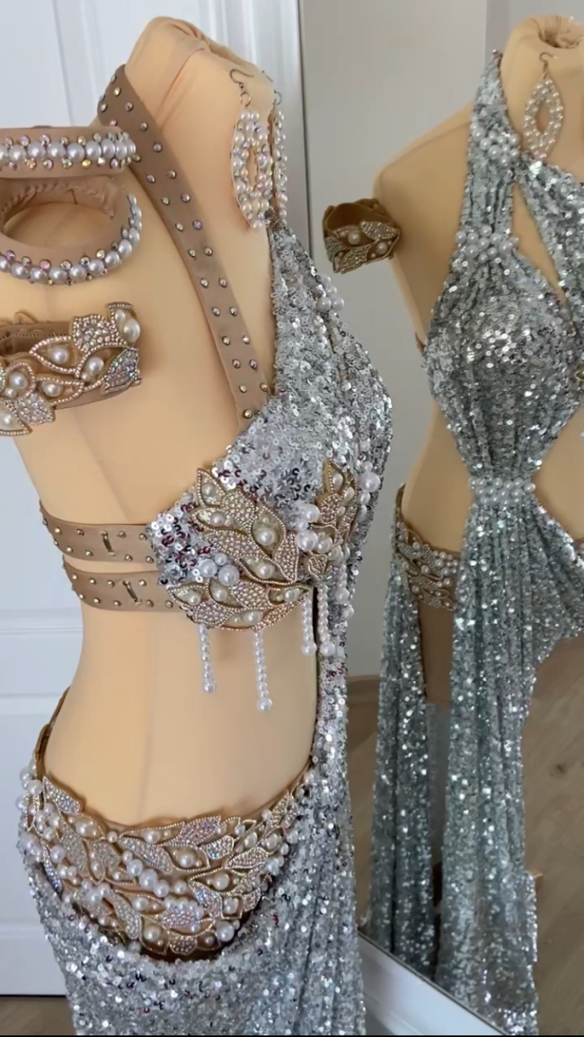 ✨ Déesse d’Argent ✨Enveloppée de perles nacrées et de sequins scintillants, cette création inspirée de la Grèce antique est le mariage parfait du glamour et de la mythologie.Un drapé fluide, une coupe asymétrique, des détails finement strassés… un hommage à l’élégance intemporelle