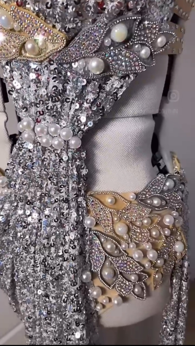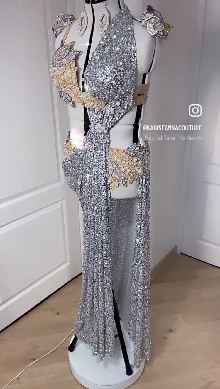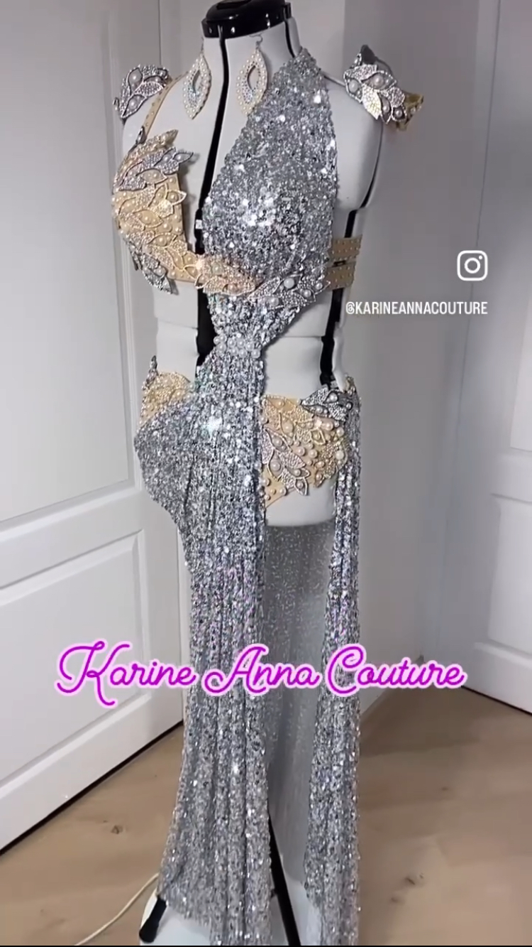 Costume sequins argent et perles nacrées, inspiration grecque