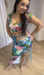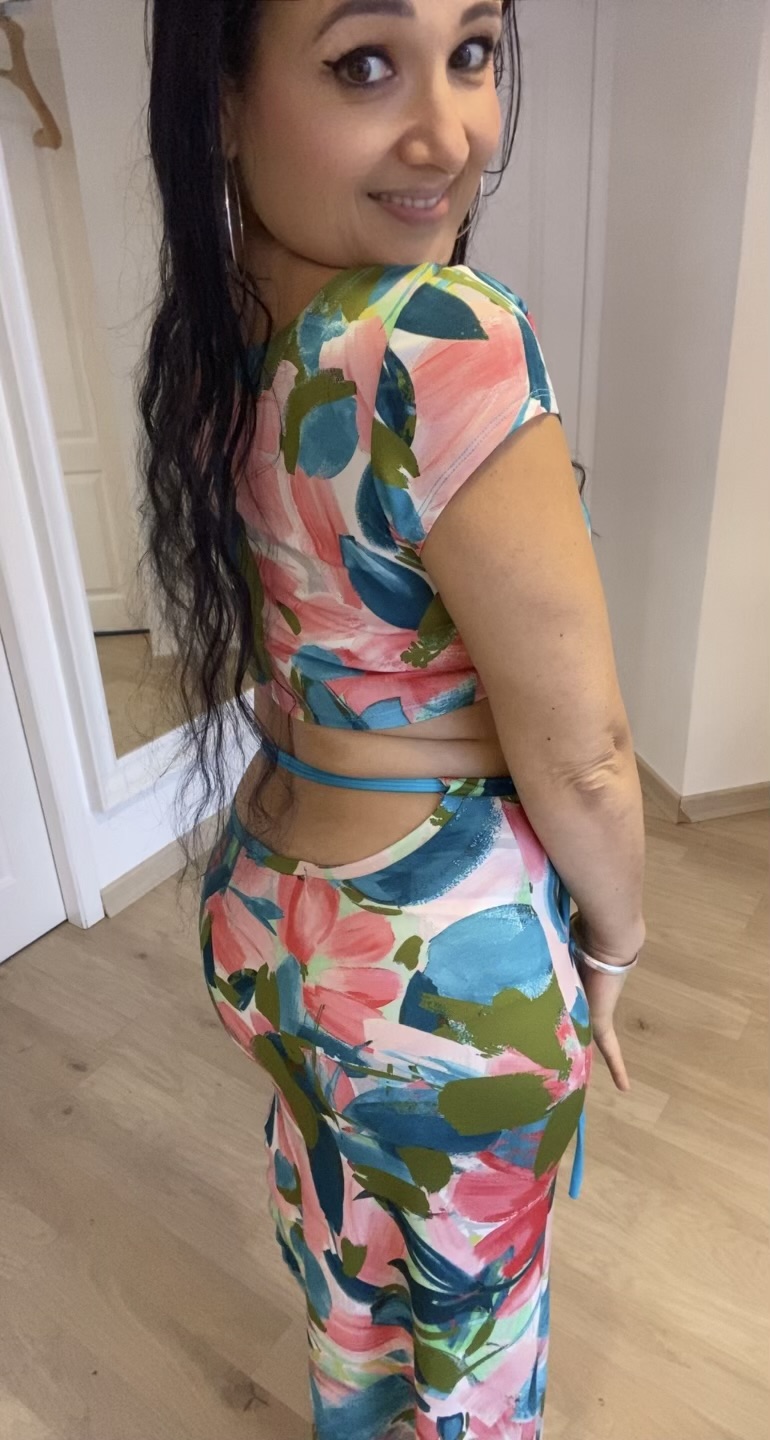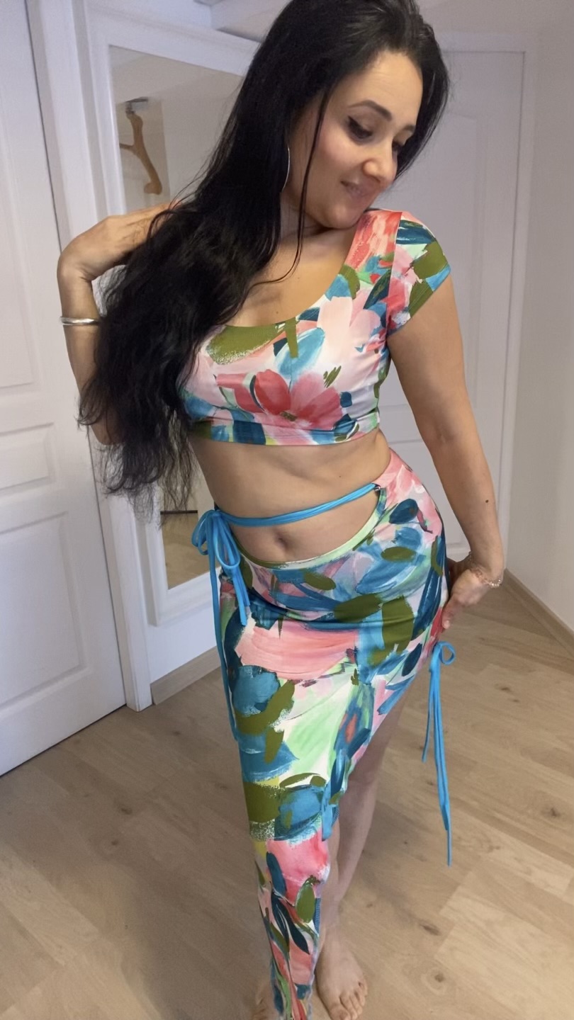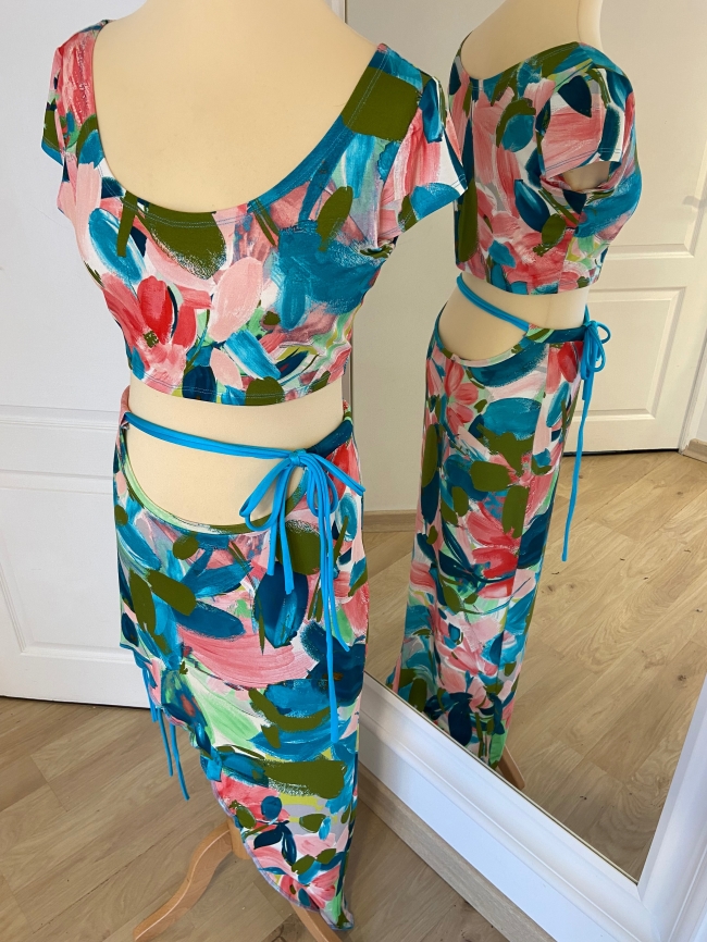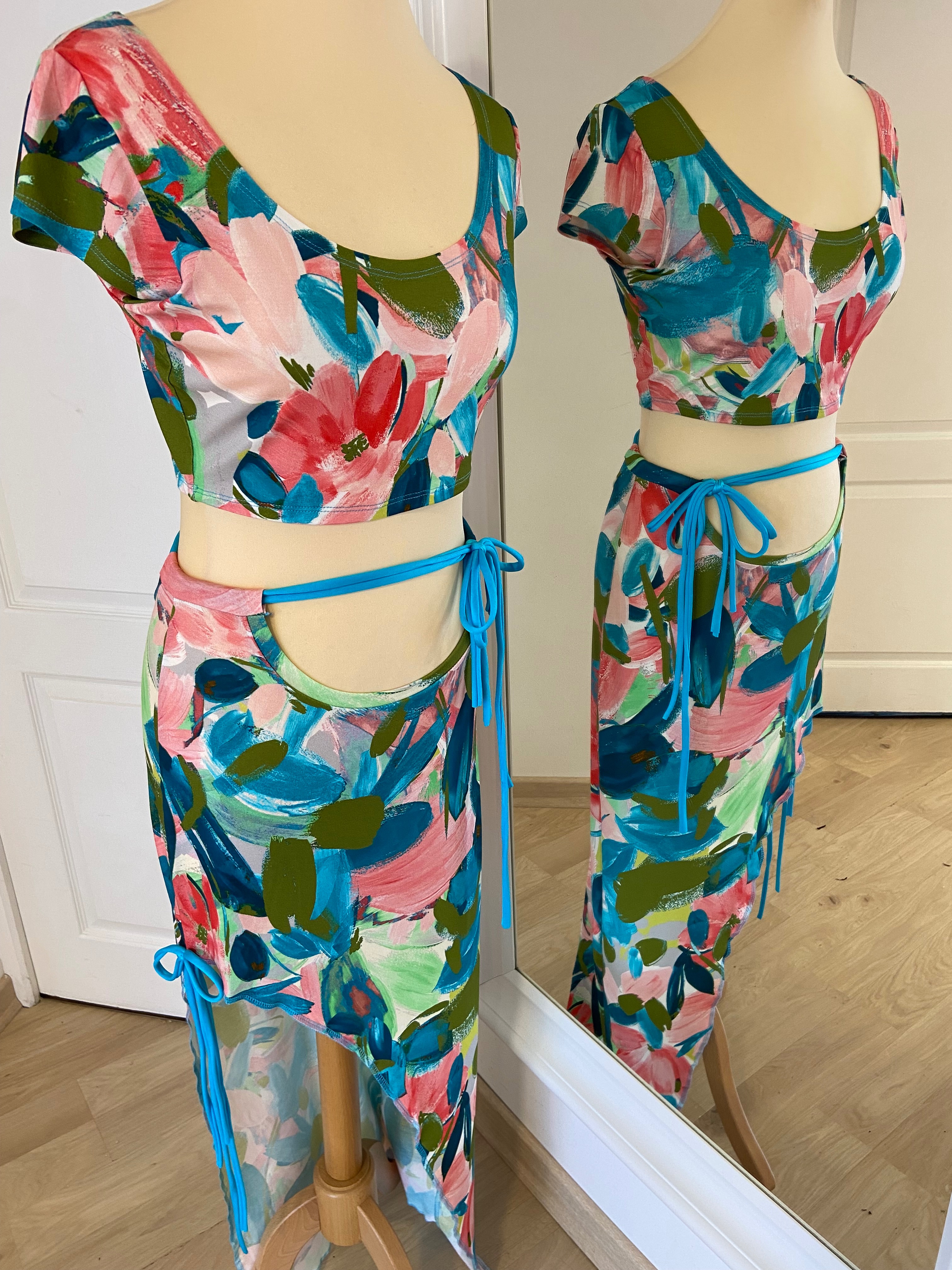 Laissez votre corps s’exprimer avec cette tenue artistique et pleine de caractère 🎨Une jupe asymétrique ventre nu et réglable, associée à un crop top assorti, à la fois charmant, confortable et résolument féminin.