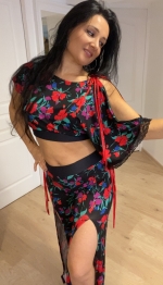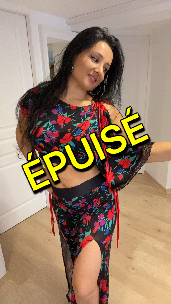 Ensemble jupe ventre nu noir imprimé petites fleurs rouges