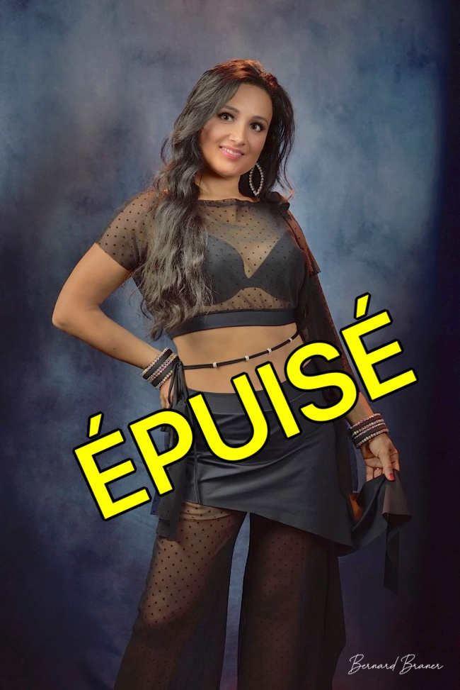 Un ensemble féminin composé d'un pantalon large en tulle plumetis avec jupette incorporée et top asymétrique grande manche fendue