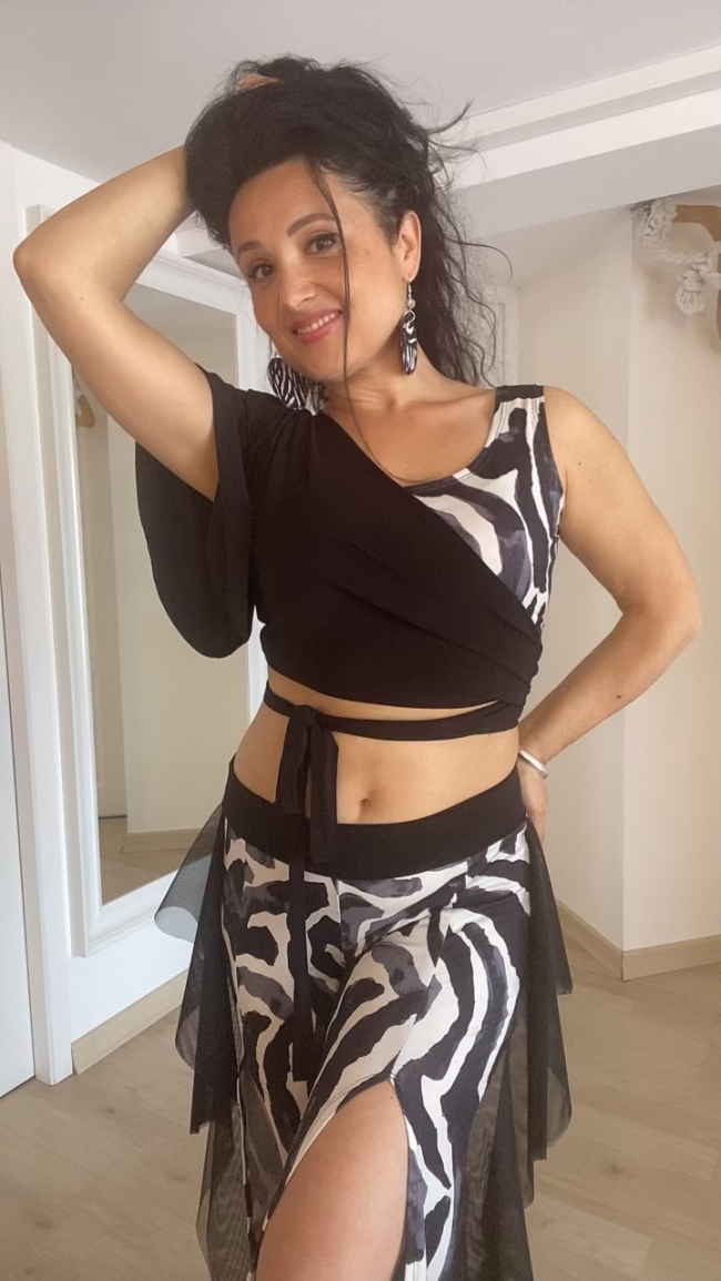 Du plus bel effet dans son imprimé incroyable !!!! L'ensemble zèbre pantalon fendu devant et volants de tulle sur les côtés, top bi-matière composé d'un débardeur et d'un cache-coeur à nouer sur le côté