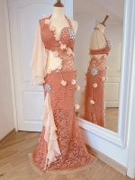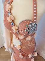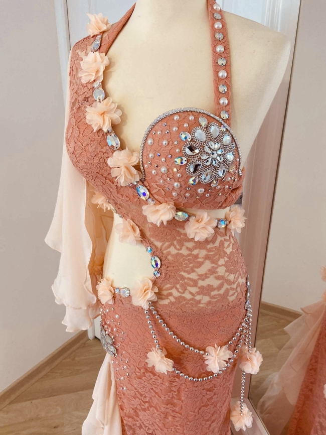 Une création élégante et lumineuse qui allie délicatesse et glamour.Dentelle raffinée, mousseline légère et ornements de strass, perles et fleurs 3D pour une silhouette unique et scintillante.