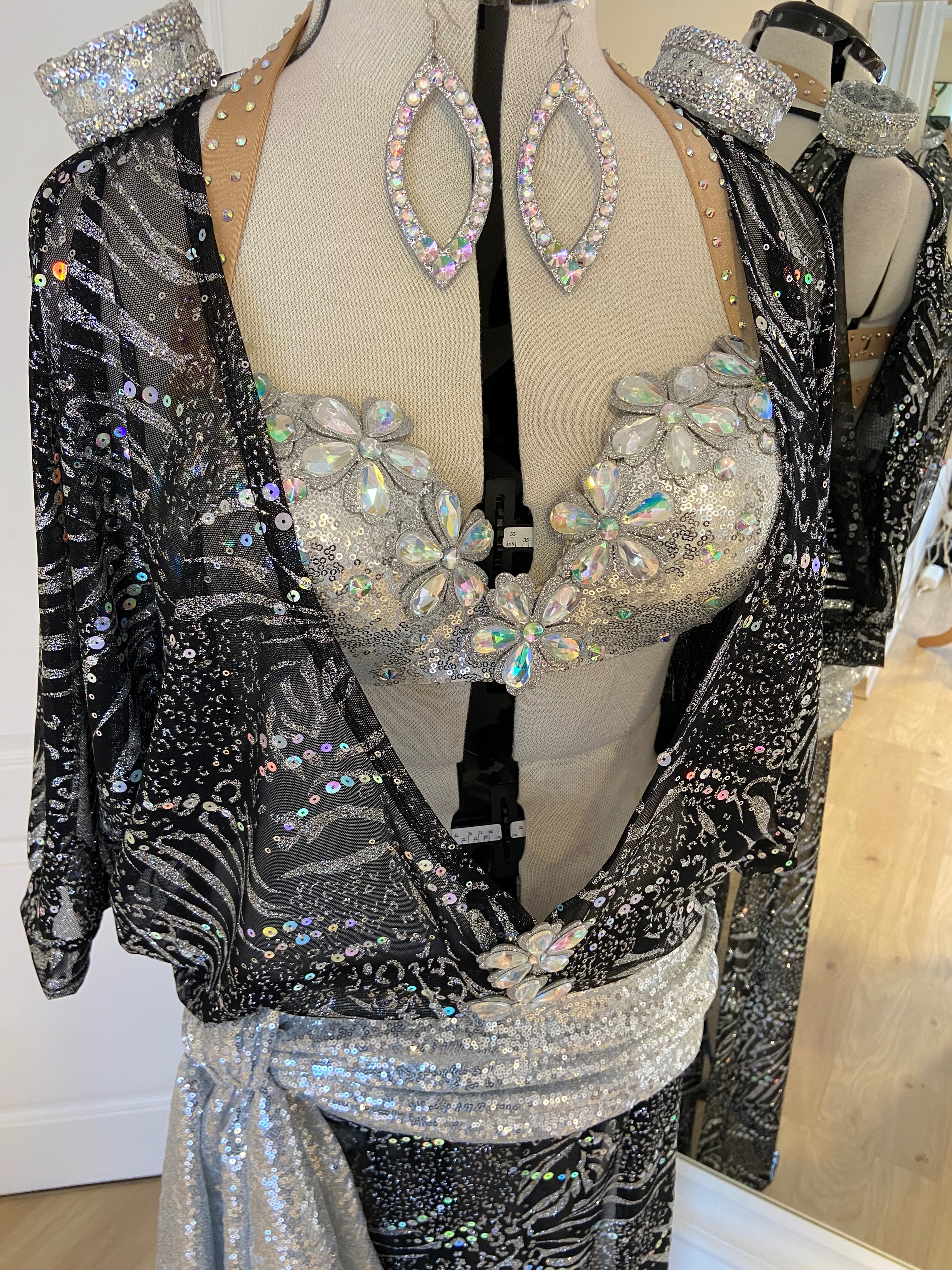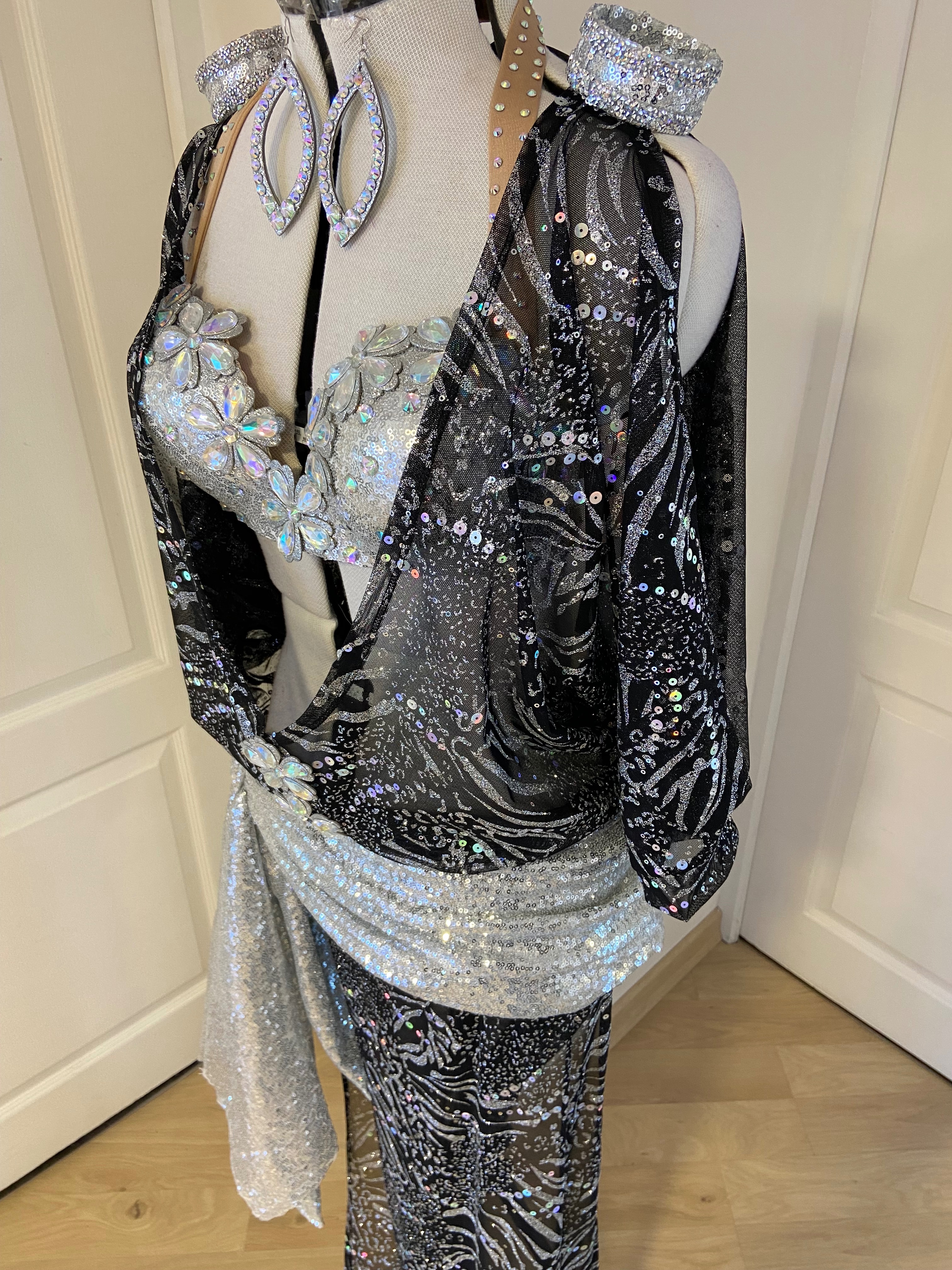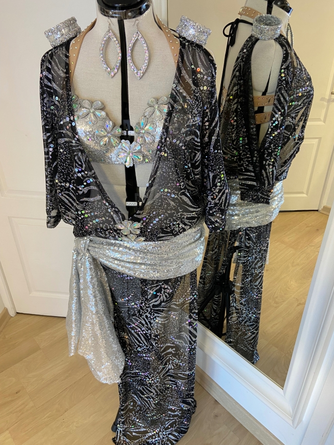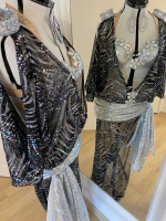 Une robe élégante et éclatante avec bijoux assortis, une coupe majestueuse et des détails précieux pour une présence inoubliable sur scène