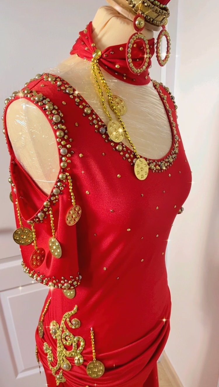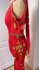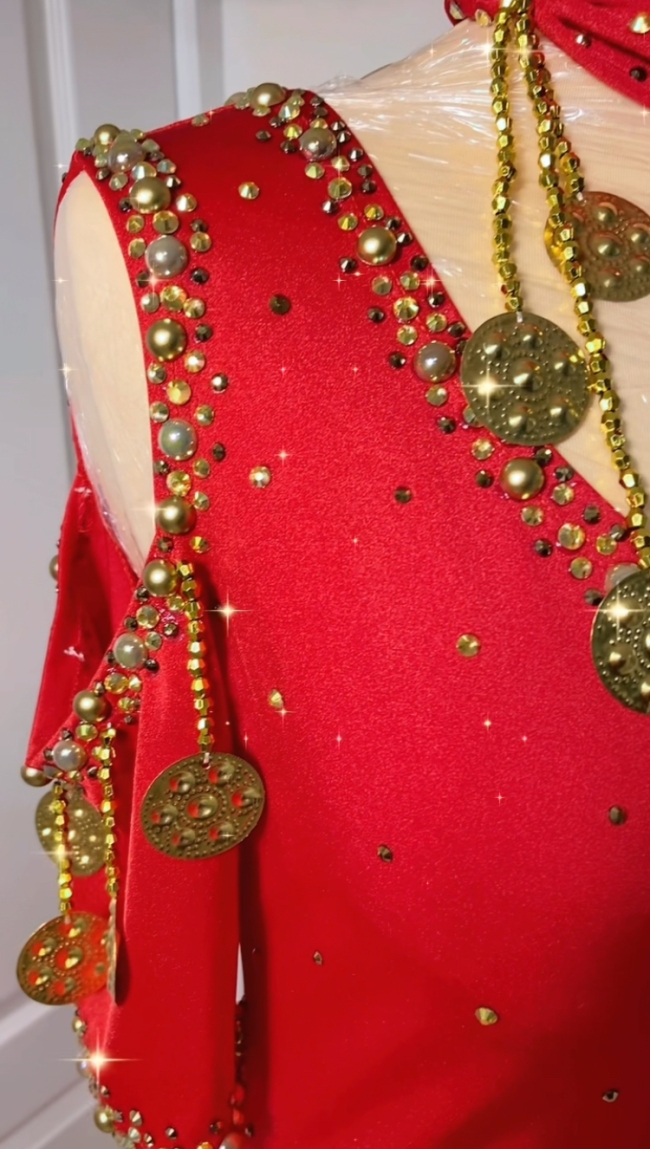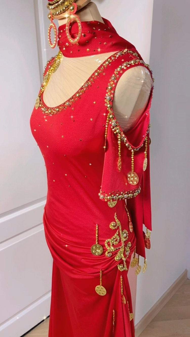 Une subtil mélange de tradition et d’élégance orientale ! Une robe baladi/saidi épaules nues, encolure ronde et minutieusement travaillée avec des broderies, perles, strass et jolies piécettes métal doré en forme de sagattes