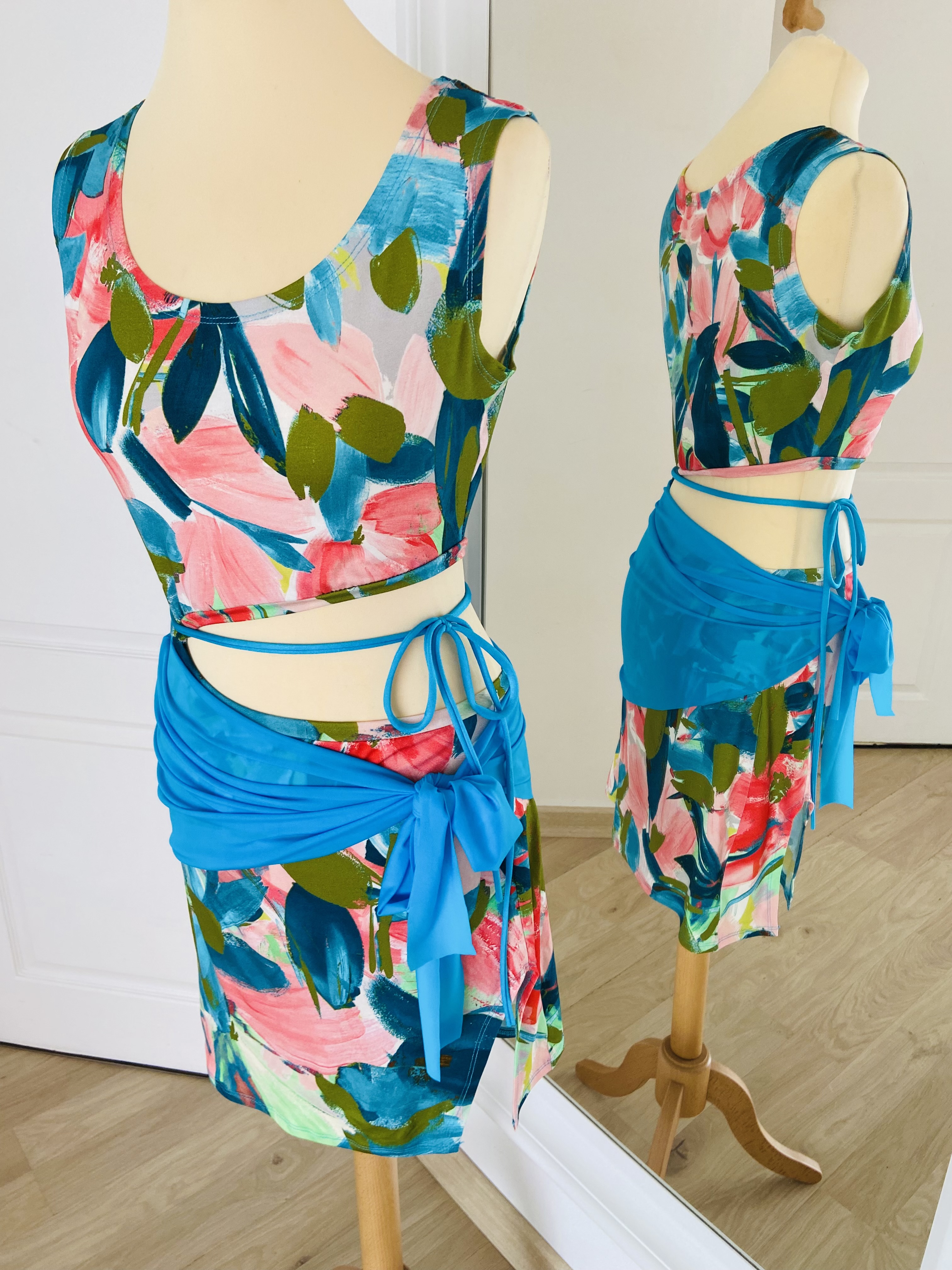 Jupette fendue, et ouverture diagonale à la taille pour magnifier la silhouette, foulard de hanche intégré à nouer sur le côté pour accompagner chacun de vos mouvements âš